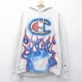 XL★古着 長袖 チャンピオン Champion リバースウィーブ パーカー メンズ ビッグロゴ ファイヤーパターン ハンドペイント エアブラシ 大きいサイズ 薄グレー 霜降り他【spe】 26apr24