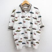 XL★古着 半袖 ポロ シャツ メンズ 車 クラシックカー 星条旗 総柄 大きいサイズ コットン 白他