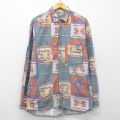L★古着 長袖 ラガー シャツ メンズ 90年代 90s クレイジーパターン マルチカラー コットン 赤他