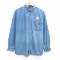 XL★古着 長袖 シャツ メンズ 90年代 90s ディズニー ミッキー 大きいサイズ ロング丈 コットン ボタンダウン 紺 デニム
