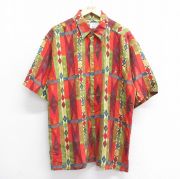 XL★古着 半袖 シャツ メンズ 00年代 00s 総柄 ロング丈 シルク 赤他