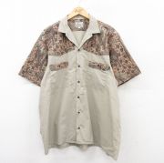 XL★古着 半袖 シャツ メンズ 総柄 ロング丈 開襟 オープンカラー 茶他