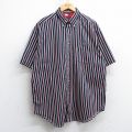 【商品名】 XL★古着 トミーヒルフィガー 半袖 ブランド シャツ メンズ 90年代 90s ワンポイントロゴ ロング丈 コットン ボタンダウン 紺他 ストライプ【spe】