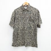 L★古着 半袖 シャツ メンズ 90年代 90s 総柄 レーヨン 薄紺他