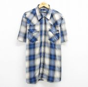 XL★古着 半袖 ウエスタン シャツ メンズ 大きいサイズ ロング丈 青他 オンブレ チェック