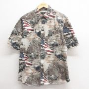 L★古着 半袖 シャツ メンズ 00年代 00s 旗 総柄 コットン ボタンダウン 濃紺