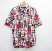 XL★古着 トミーヒルフィガー 半袖 ブランド シャツ メンズ ワンポイントロゴ パッチワーク 大きいサイズ コットン ボタンダウン 赤他 チェック