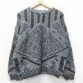 L★古着 長袖 セーター メンズ 90年代 90s ネイティブ柄 ラグ柄 レザー使用 クルーネック 黒他