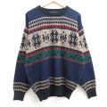 L★古着 長袖 ノルディック セーター メンズ 90年代 90s 雪柄 クルーネック 紺他