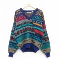 XL★古着 長袖 セーター メンズ 90年代 90s ネイティブ柄 ラグ柄 アクリル Vネック 紺他