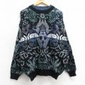 XL★古着 長袖 セーター メンズ 90年代 90s ラグ柄 大きいサイズ アクリル クルーネック 黒他