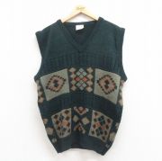 L★古着 ニット ベスト メンズ 80年代 80s ネイティブ柄 ラグ柄 Vネック イギリス製 緑