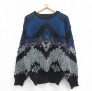 M★古着 長袖 セーター メンズ 90年代 90s ネイティブ柄 アクリル クルーネック 紺他