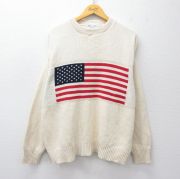 XL★古着 長袖 セーター メンズ 90年代 90s 星条旗 コットン クルーネック USA製 生成り