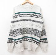 L★古着 長袖 セーター メンズ 90年代 90s ネイティブ柄 ラグ柄 アクリル クルーネック 緑他