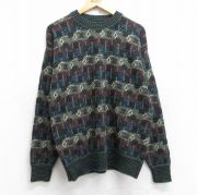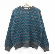 L★古着 長袖 セーター メンズ 90年代 90s 総柄 クルーネック 青緑他