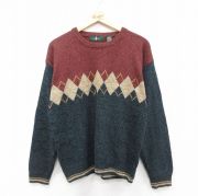 L★古着 長袖 セーター メンズ 90年代 90s アーガイル クルーネック 緑系他
