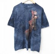 XL★古着 半袖 Tシャツ メンズ オオカミ 大きいサイズ ロング丈 コットン クルーネック 紺他 タイダイ