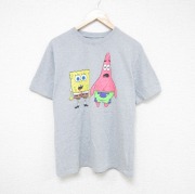 L★古着 半袖 Tシャツ メンズ アニメ ニコロデン スポンジボブ クルーネック グレー 霜降り