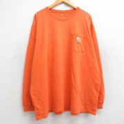 XL★古着 カーハート 長袖 Tシャツ メンズ ワンポイントロゴ 胸ポケット付き 大きいサイズ コットン クルーネック オレンジ