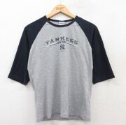 M★古着 7分袖 ビンテージ Tシャツ メンズ 00年代 00s MLB ニューヨークヤンキース ラグラン クルーネック グレー 霜降り他 メジャーリーグ ベースボール 野球