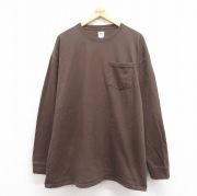 XL★古着 ラッセル 長袖 Tシャツ メンズ 無地 胸ポケット付き 大きいサイズ コットン クルーネック こげ茶
