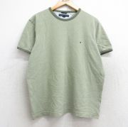 L★古着 トミーヒルフィガー 半袖 ブランド Tシャツ メンズ ワンポイントロゴ 鹿の子 クルーネック 薄緑 リンガー