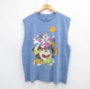 XL★古着 ノースリーブ Tシャツ メンズ ルーニーテューンズ バッグスバニー タズ バスケットボール コットン クルーネック 薄紺 霜降り