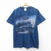 L★古着 半袖 ビンテージ Tシャツ メンズ 00年代 00s 機関車 コットン クルーネック 紺