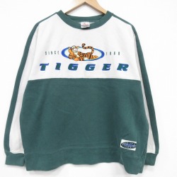 L★古着 長袖 スウェット メンズ 00年代 00s ディズニー くまのプーさん ティガー 刺繍 ラグラン クルーネック 白他